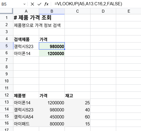 chanisheet의 예제를 보면 B5 셀에 =VLOOKUP(A5,A13:C16,2,FALSE) 함수가 사용되었습니다. 이 함수는 A5에 있는 "갤럭시S23"을 A13:C16 범위에서 찾아 해당 행의 두 번째 열(가격)인 980000을 반환합니다. 이처럼 chanisheet에서는 실제 작동하는 예제를 통해 함수 사용법을 직관적으로 배울 수 있습니다.