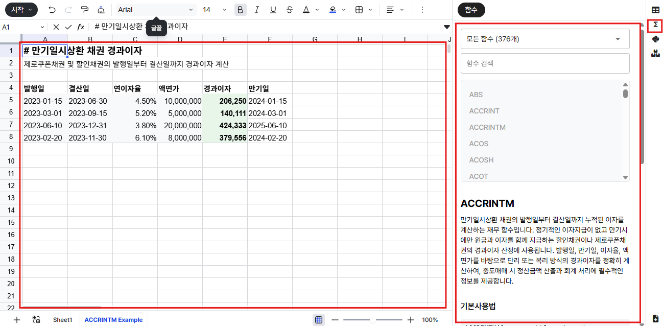 - 왼쪽 영역: 실제 엑셀 데이터와 함수가 구현된 실습 영역