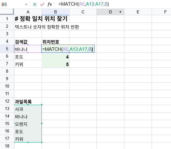 chanisheet 예제를 보면 =MATCH(A5,A13:A17,0) 함수가 사용됩니다. 이 함수는 A5 셀의 값("바나나")을 A13:A17 범위에서 찾아 해당 값의 위치(2)를 반환합니다. match_type이 0이므로 정확히 일치하는 값만 찾습니다. 이 결과는 "바나나"가 검색 범위의 두 번째 위치에 있다는 것을 의미합니다.
