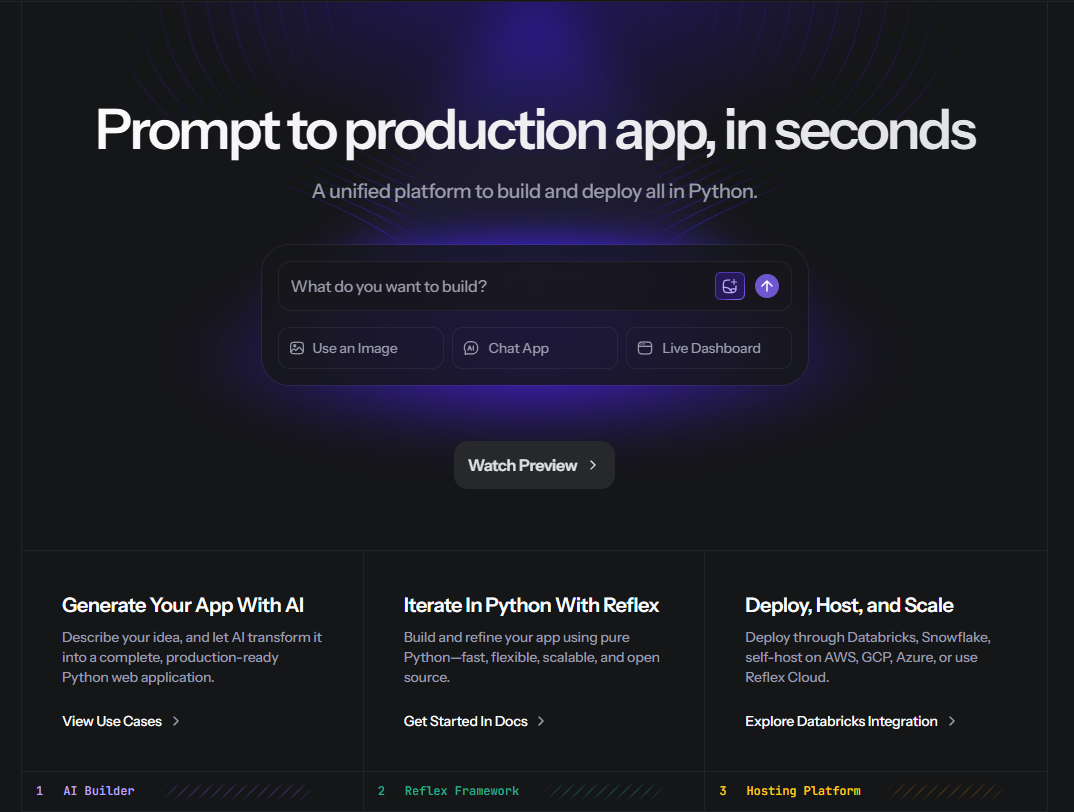 Reflex Cloud는 reflex deploy 명령어 하나로 복잡한 클라우드 설정 없이 즉시 웹앱을 배포할 수 있는 통합 호스팅 서비스입니다. AWS, GCP, Azure 같은 클라우드 플랫폼에서 별도로 서버 설정, 도메인 연결, SSL 인증서 설정을 할 필요 없이, 로컬에서 개발한 파이썬 앱이 자동으로 프로덕션 환경에 배포되어 공개 URL을 제공받습니다. 커스텀 도메인 연결도 플랫폼 내에서 간단하게 설정할 수 있어, 기존 클라우드 서비스에서 필요한 DNS 설정과 인증서 관리 과정을 생략할 수 있습니다.